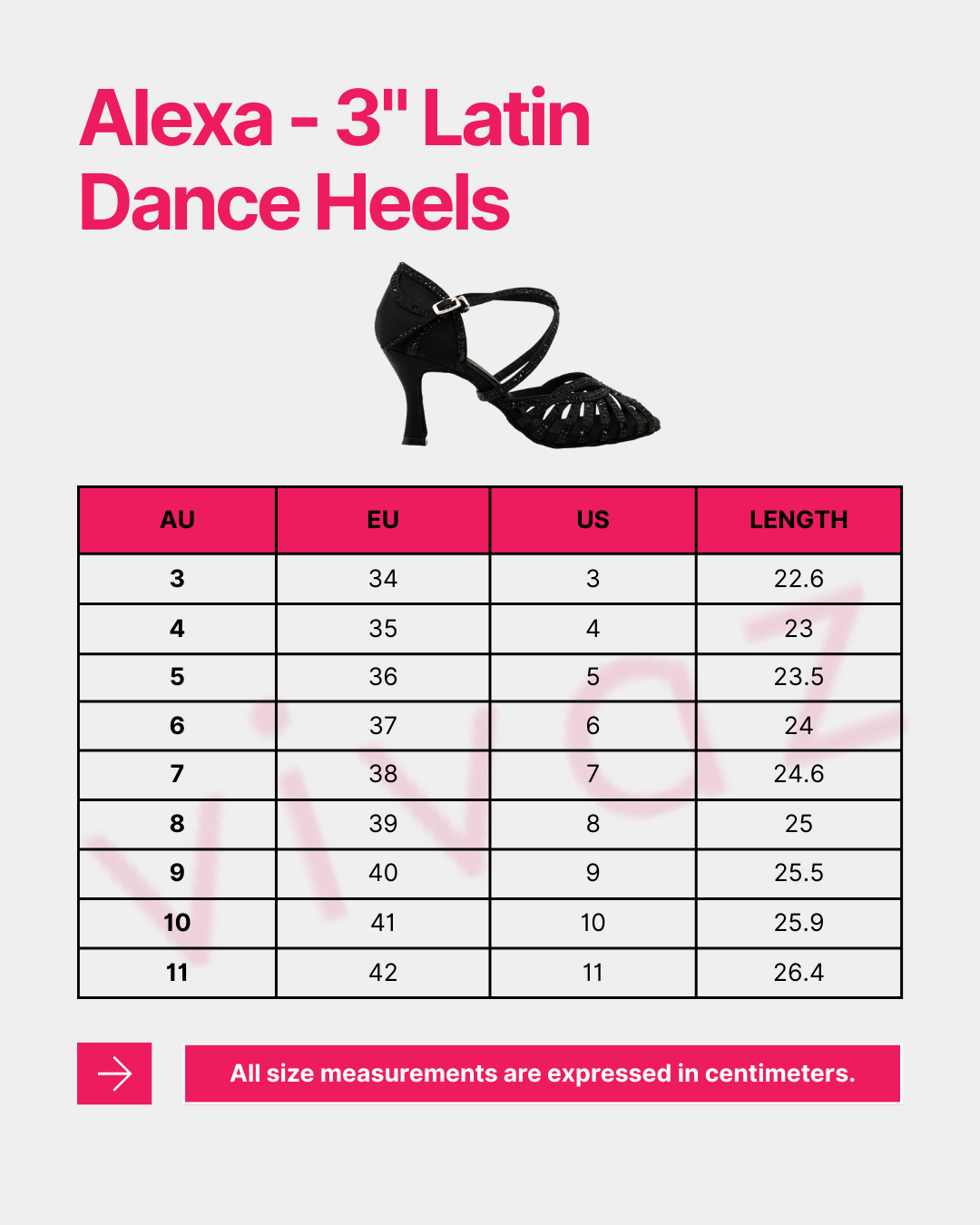 The Alexa is made in EU shoe sizing and is a firm fit. Please note that dance shoes should fit firm and snug. We recommend ordering your usual shoe size in Alexa, or one size up if you have a wide foot.