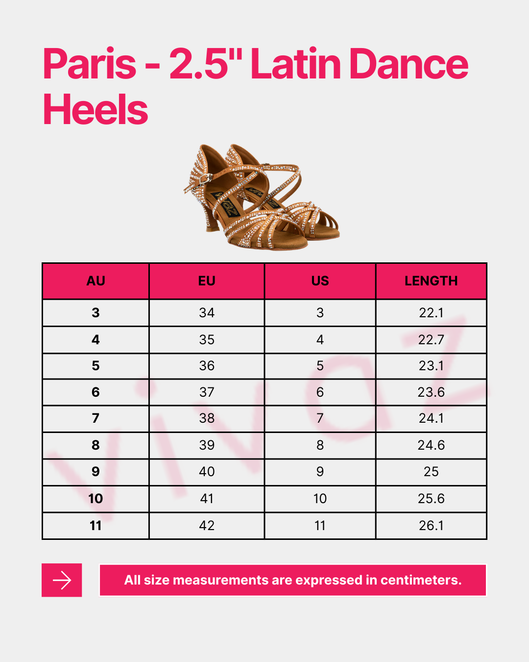 Paris is made in EU sizing and is true to size, designed for a firm, snug fit—just as dance shoes should be. If you prefer a tighter fit, consider ordering your usual size or one size down.